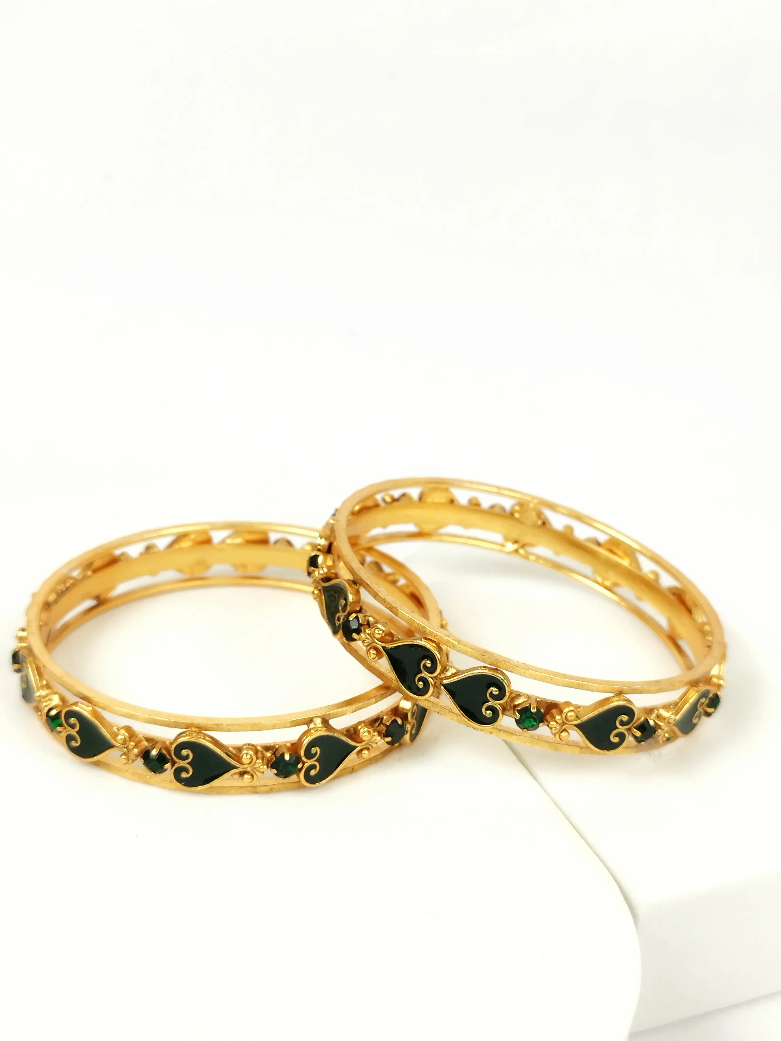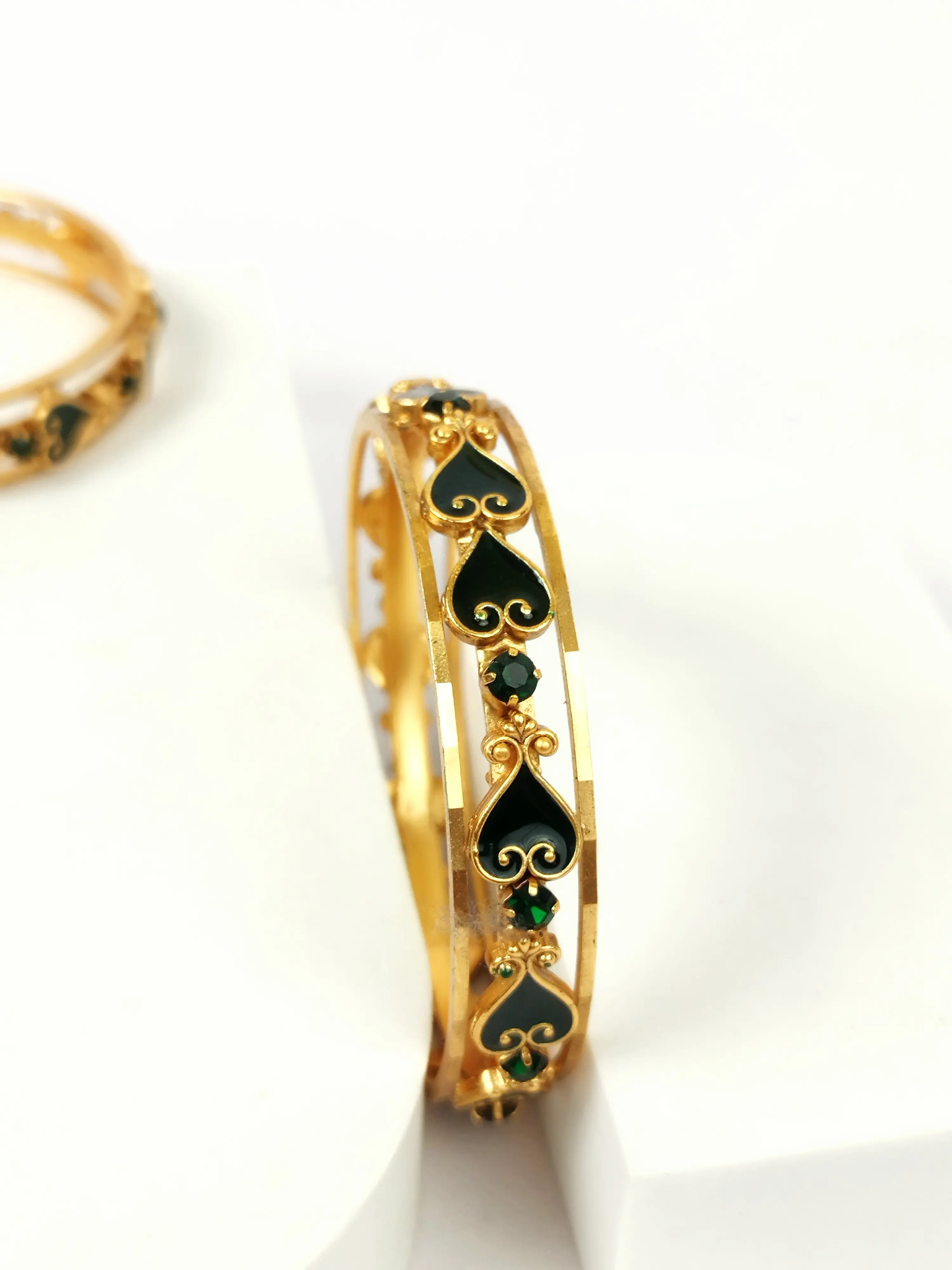 This fashionable gold-tone bangle features bold black enamel heart shapes, offering a striking, high-contrast design. It’s an ideal accessory for contemporary fusion wear and makes a statement when worn solo or stacked.
