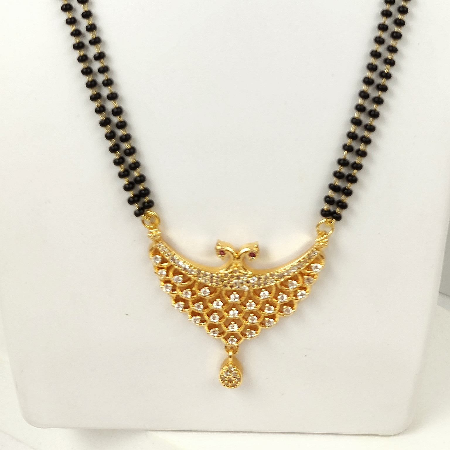 A stunning double-line black bead chain featuring a traditional crescent-shaped pendant. The intricate gold work and sparkling AD stones give the look of a rich, gold temple jewelry piece.