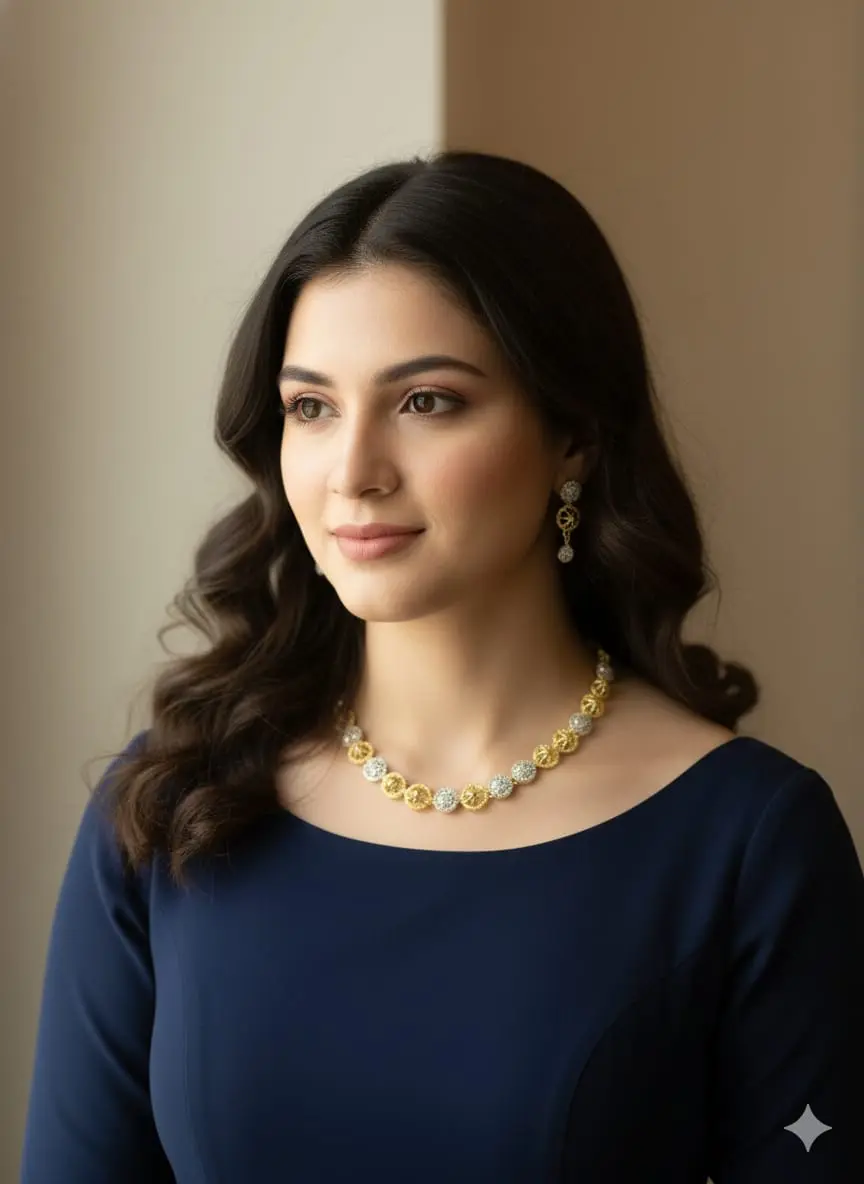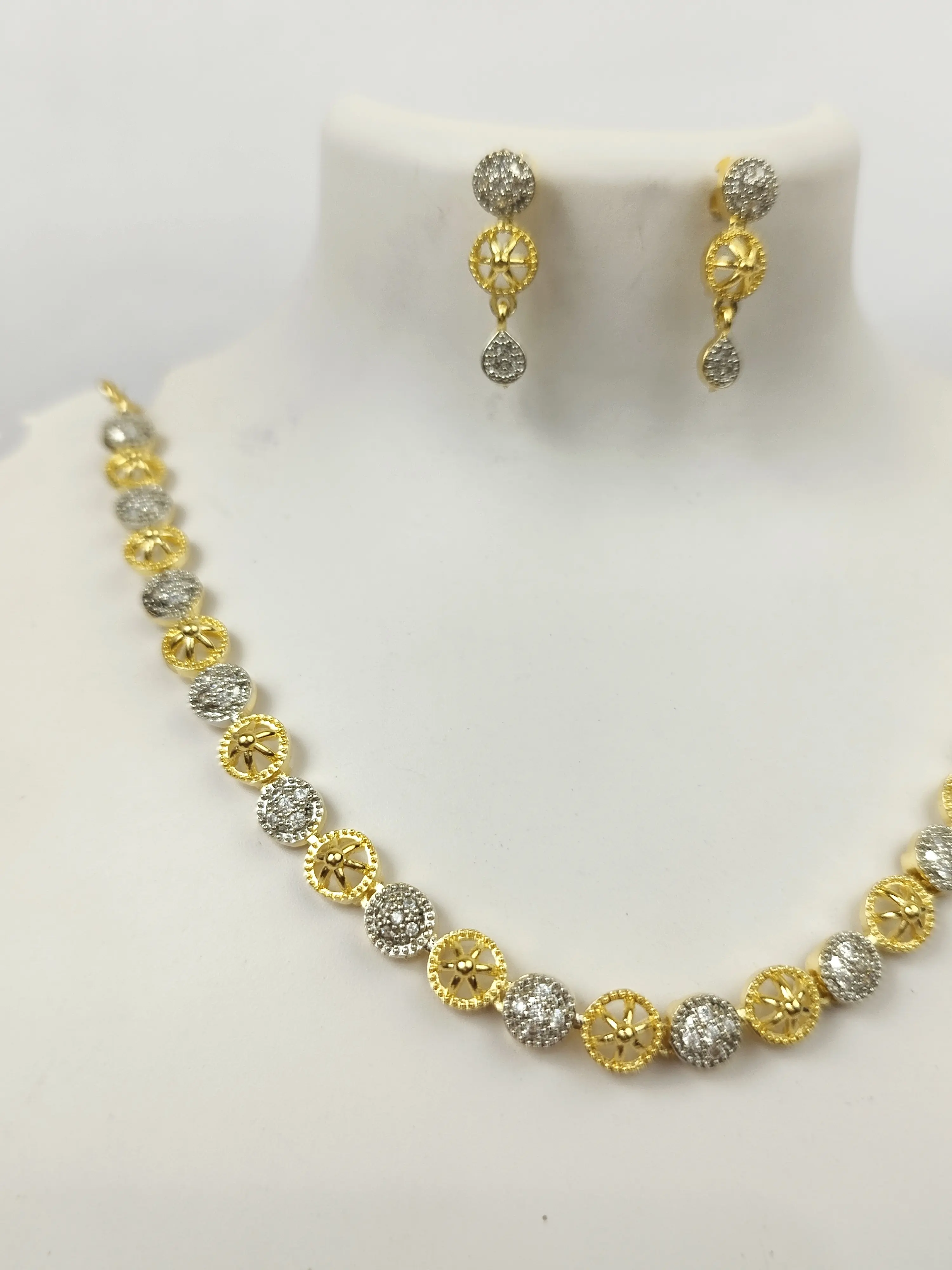 A modern and chic AD stone necklace featuring an alternating pattern of polished gold-tone links and sparkling AD-studded flower clusters. The two-tone finish offers a sophisticated blend, perfect for contemporary office or party wear.