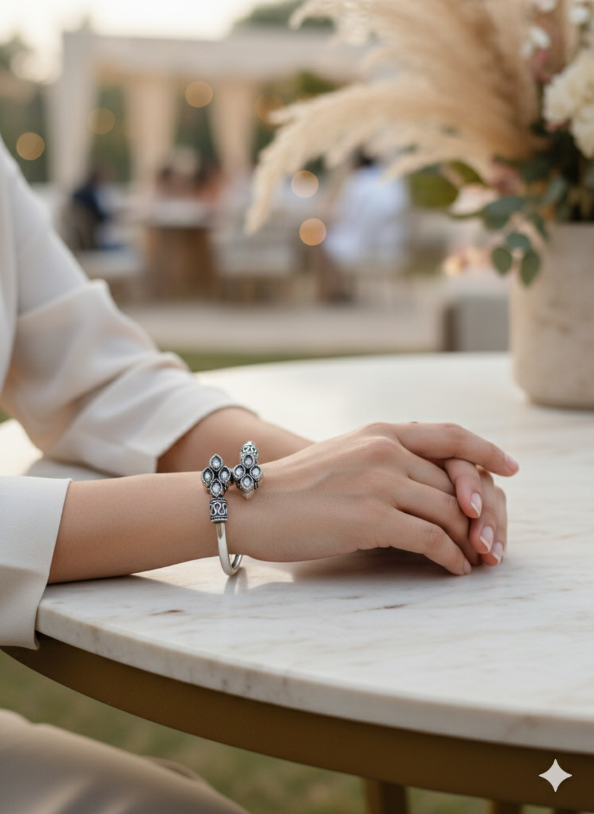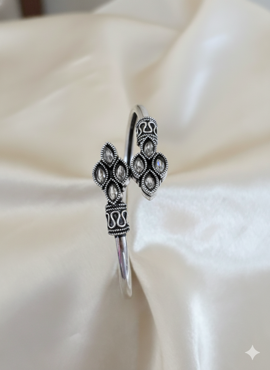 Infuse your style with bohemian charm. This antiqued silver-tone cuff features intricate tribal engravings and a bypass design tipped with marquise-cut white stone accents. The oxidized finish provides a vintage, handcrafted look perfect for festival or ethnic attire.
